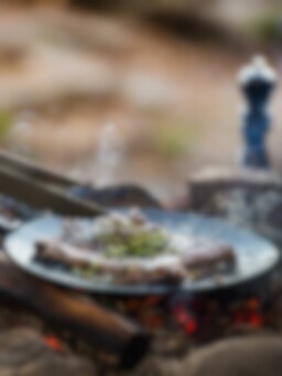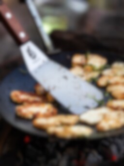 Det skal ikke være vanskelig å gå ut og lage god mat på ferien. Hällmark tilbyr alt fra små stekepanner til vedovner og kaffekjeler. Våre ambassadører Ida og Joe (@iskogochmark) ønsker å inspirere flere til å dra ut sammen med familie og venner. Her brukes stekepannen (28 cm) og jegerpannen (21 cm) til å lage en god middag og dessert over åpen ild. Det fungerer utmerket å steke kjøttet på denne måten, å få en god varme som du trenger for en fin stekeflate er enkelt og pannene er små og lette å jobbe med, passer for både voksne og barn. Her tilberedes entrecote i rikelig med smør, salt, pepper og timian og til dessert stekt granola med honning, jordbær med lime og vaniljesaus. Ekte feriemat, rett og slett!