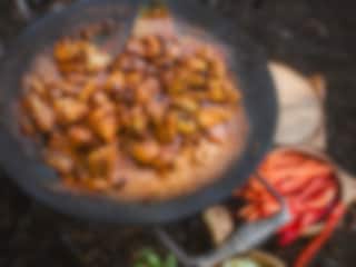 Et hett tips er å lage en ferdig krydderblanding hjemme med gult karripulver, ingefær, sambal oelek, paprikapulver, honning og salt og ta det ut i en boks. Du kan gjøre det samme med krem og creme fraiche, hell akkurat passe mengde i en boks og du slipper å bære rundt på unødvendig mengde. Forbered så mye som mulig hjemme, du kan også finhakke hvitløken og kutte opp bacon og kylling på forhånd så går det raskt og enkelt å tilberede når du først står ved bålet.