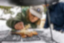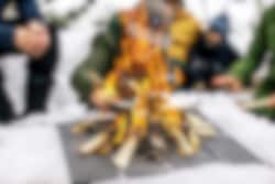 Brannunderlag til å fyre bål på snø eller is. Ved hjelp av de fire snøankrene forblir underlaget flatt på bakken og bålet hindres i å synke ned i bakken og dø ut. Underlaget er kompatibel med bålstativet vårt, som gjør det mulig å sette en kaffekanne eller en av våre stekeplater over bålet. Medfølger en oppbevaringspose til underlaget i under transport. Utbrettede mål er 44 x 44 cm.