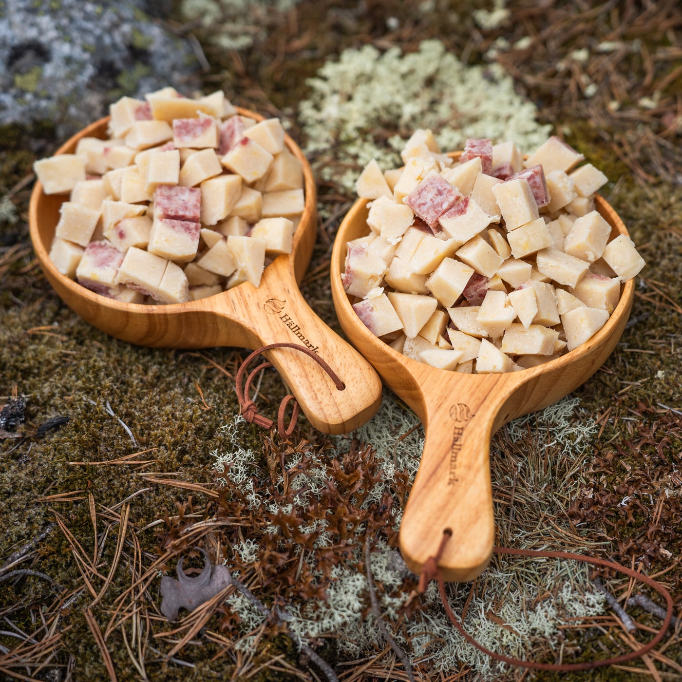 En stor treskål som kan brukes som både tallerken og skål. Skålens mål: høyde ca 3,5 cm, diameter ca 14 cm