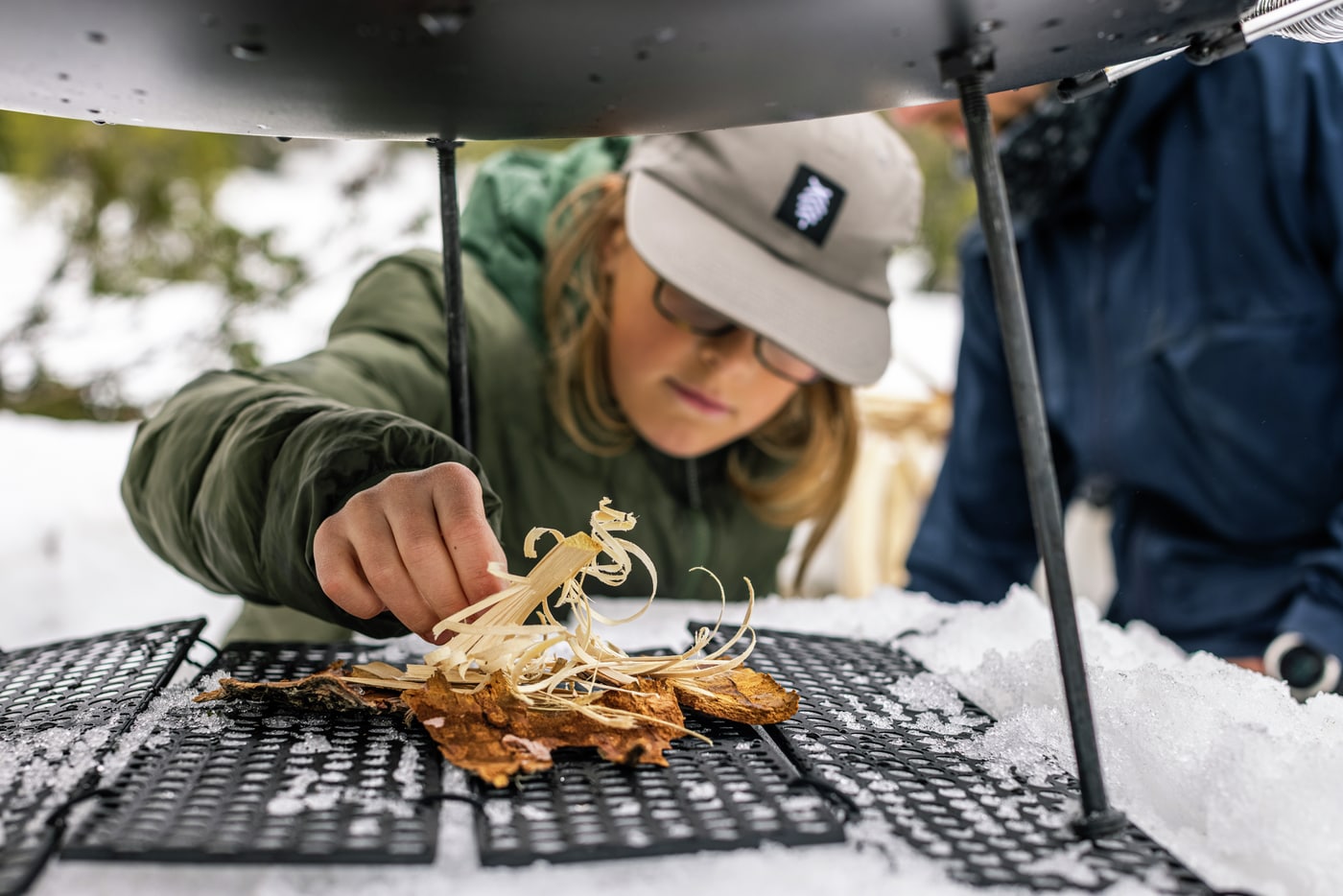 Brannunderlag til å fyre bål på snø eller is. Ved hjelp av de fire snøankrene forblir underlaget flatt på bakken og bålet hindres i å synke ned i bakken og dø ut. Underlaget er kompatibel med bålstativet vårt, som gjør det mulig å sette en kaffekanne eller en av våre stekeplater over bålet. Medfølger en oppbevaringspose til underlaget i under transport. Utbrettede mål er 44 x 44 cm.