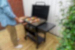 Stekebord med avlastningsflater og mulighet for å regulere fire varmesoner individuelt. Fabrikkinnoljet stekeplate i stål. Sidebordene kan foldes ut for å minimere plass når bordet ikke er i bruk. Hylle og skuff under. Holder for kjøkkenhåndkle og kroker til redskap. Avtakbar fettoppsamler for enklere rengjøring. Regulator for Sverige, slange og beskyttelsestrekk følger med.