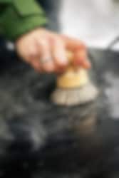 Oppvaskbørste i tre. Liten, praktisk og lett pakkebar med et stabilt grep selv om det blir vått. Våre kokeplater skal håndteres på samme måte som en støpejerns stekepanner. Varm opp vann i stekehellen og vask enkelt ved hjelp av børsten. Olje gjerne pannen etter bruk. Ikke bruk vaskemiddel. Størrelse 6 × 6 cm.